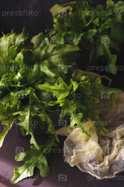 Свежесобранные листья салата с желто-коричневым фоном, сдержанный, избирательный фокус