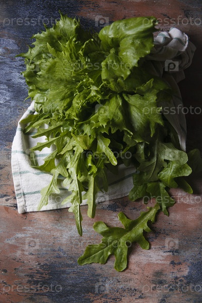 Свежесобранные листья салата на деревенском деревянном столе