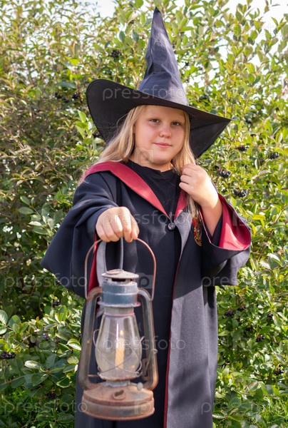 Девочка в мантии и шляпе. Маленькая волшебница в костюме. Сказковая героиня. Ребенок-модель. Девушка в халате и шляпе. Небольшая колдунья в костюме. Сказочная героиня. Ребенок - модель