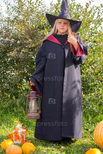 Девочка в мантии и шляпе. Маленькая волшебница в костюме. Сказковая героиня. Ребенок-модель. Девушка в халате и шляпе. Небольшая колдунья в костюме. Сказочная героиня. Ребенок - модель