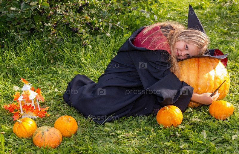 Девочка в мантии и шляпе. Маленькая волшебница в костюме. Сказковая героиня. Ребенок-модель. Девушка в халате и шляпе. Небольшая колдунья в костюме. Сказочная героиня. Ребенок - модель