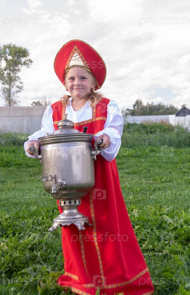 Портрет. красивая нарядная девушка в русском народном костюме с самоваром. портрет. красивая элегантная девочка в российском народном костюме с самоваром. child is a model