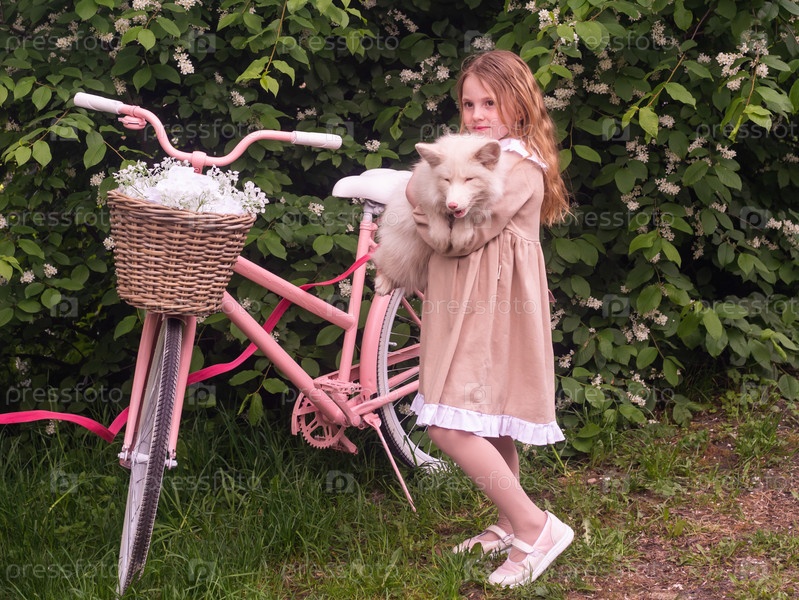 Портрет. Красивая одетая девушка держит в руках белую лису. Ребенок - модель. Портрет. Красивая, элегантная девочка держит в объятиях белую лису. Ребёнок является моделем