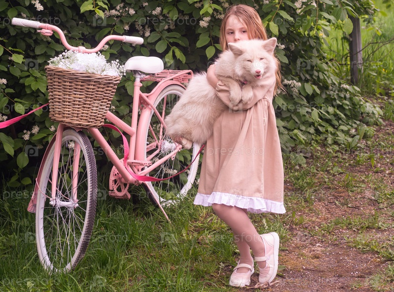 Портрет. Красивая одетая девушка держит в руках белую лису. Ребенок - модель. Портрет. Красивая, элегантная девочка держит в объятиях белую лису. Ребёнок является моделем