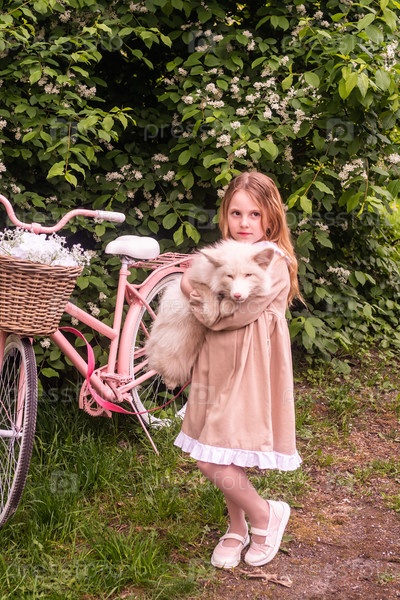 Портрет. Красивая одетая девушка держит в руках белую лису. Ребенок - модель. Портрет. Красивая, элегантная девочка держит в объятиях белую лису. Ребёнок является моделем