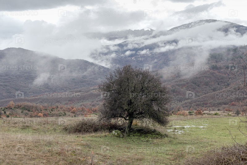 Живописные горы и одинокое дерево (Греция, Эпир) в туманный зимний день