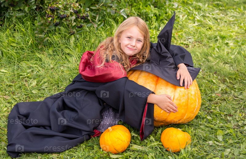 Девочка в мантии и шляпе. Маленькая волшебница в костюме. Сказковая героиня. Ребенок-модель. Девушка в халате и шляпе. Небольшая колдунья в костюме. Сказочная героиня. Ребенок - модель