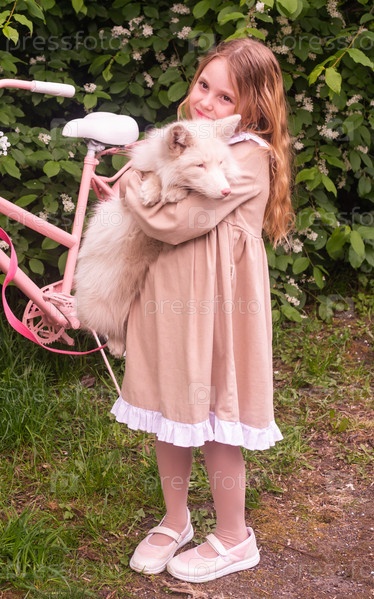Портрет. Красивая одетая девушка держит в руках белую лису. Ребенок - модель. Портрет. Красивая, элегантная девочка держит в объятиях белую лису. Ребёнок является моделем