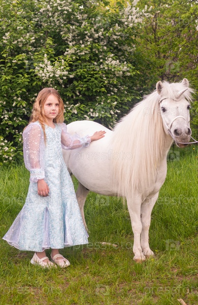 Портрет. Красивая нарядная девочка с волшебным сказочным единорогом. Девочка и белый пони. Ребенок - модель. Портрет. Красивая элегантная девушка с магическим феей-единорогом. Девушка и белое пони. Ребенок является моделем