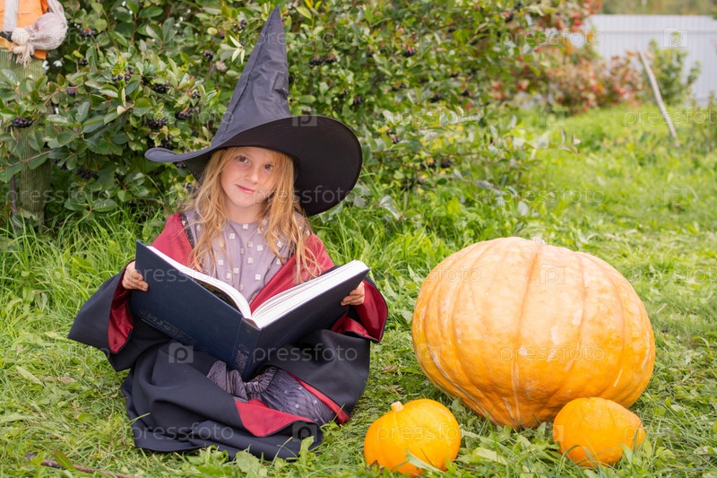 Девочка в мантии и шляпе. Маленькая волшебница в костюме. Сказковая героиня. Ребенок-модель. Девушка в халате и шляпе. Небольшая колдунья в костюме. Сказочная героиня. Ребенок - модель