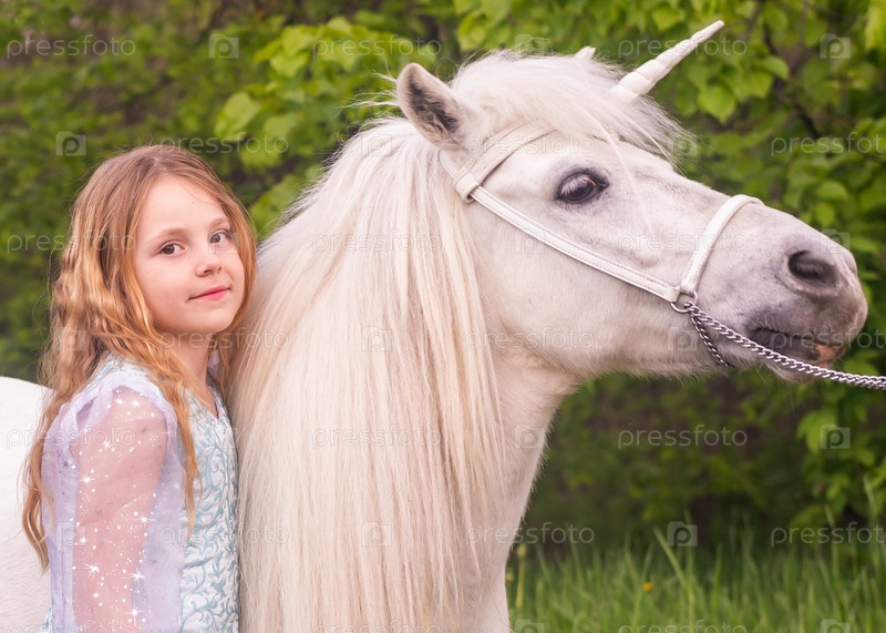 Портрет. Красивая нарядная девочка с волшебным сказочным единорогом. Девочка и белый пони. Ребенок - модель. Портрет. Красивая элегантная девушка с магическим феей-единорогом. Девушка и белое пони. Ребенок является моделем
