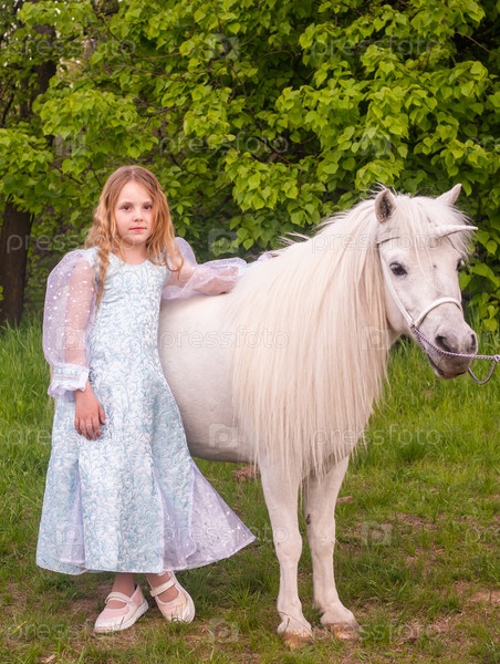Портрет. Красивая нарядная девочка с волшебным сказочным единорогом. Девочка и белый пони. Ребенок - модель. Портрет. Красивая элегантная девушка с магическим феей-единорогом. Девушка и белое пони. Ребенок является моделем