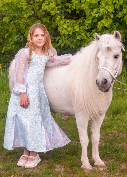 Портрет. Красивая нарядная девочка с волшебным сказочным единорогом. Девочка и белый пони. Ребенок - модель. Портрет. Красивая элегантная девушка с магическим феей-единорогом. Девушка и белое пони. Ребенок является моделем