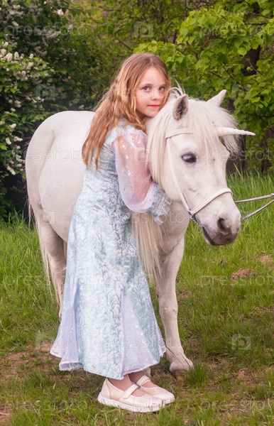 Портрет. Красивая нарядная девочка с волшебным сказочным единорогом. Девочка и белый пони. Ребенок - модель. Портрет. Красивая элегантная девушка с магическим феей-единорогом. Девушка и белое пони. Ребенок является моделем