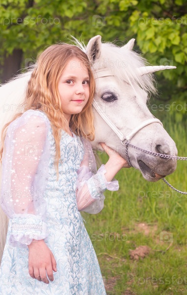 Портрет. Красивая нарядная девочка с волшебным сказочным единорогом. Девочка и белый пони. Ребенок - модель. Портрет. Красивая элегантная девушка с магическим феей-единорогом. Девушка и белое пони. Ребенок является моделем