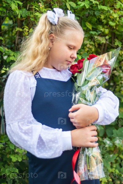 Девочка в красивой элегантной современной школьной форме на День знаний в школе