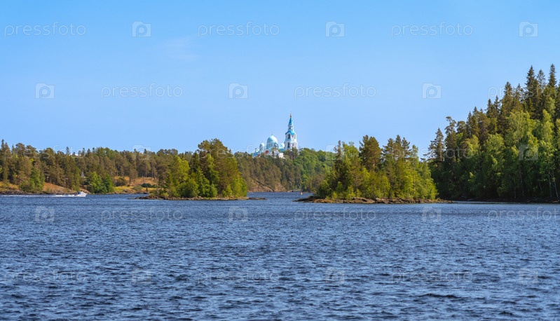 Монастырь возвышается над соснами острова Валаам в Ладожском озере