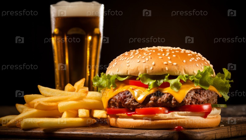 Вкусный бургер, хрустящая картошка фри, пикантный кетчуп и пиво — идеальное сочетание для любителей еды