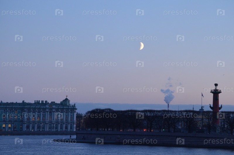 Санкт-Петербург - вечерний вид на Эрмитаж и стрелку Васильевского острова, закат, луна
