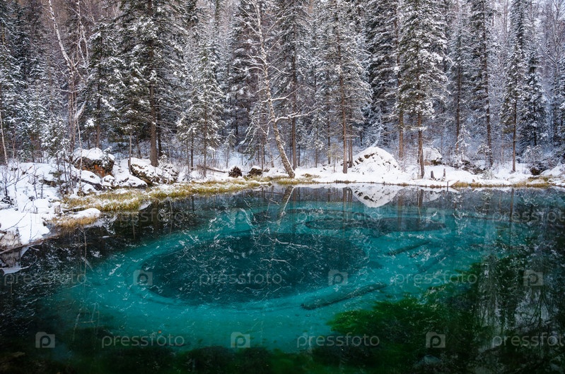 Тайное озеро в снежном лесу, рисунок из голубой глины не дне. Алтай