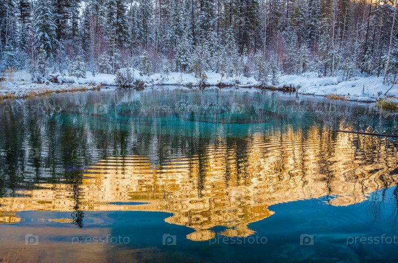 Отражение золотой горы в бирюзовом озере, первый снег, ноябрь