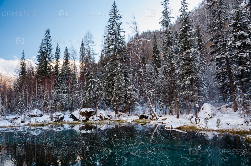 Бирюзовое озеро в лесу, ноябрь, Алтай