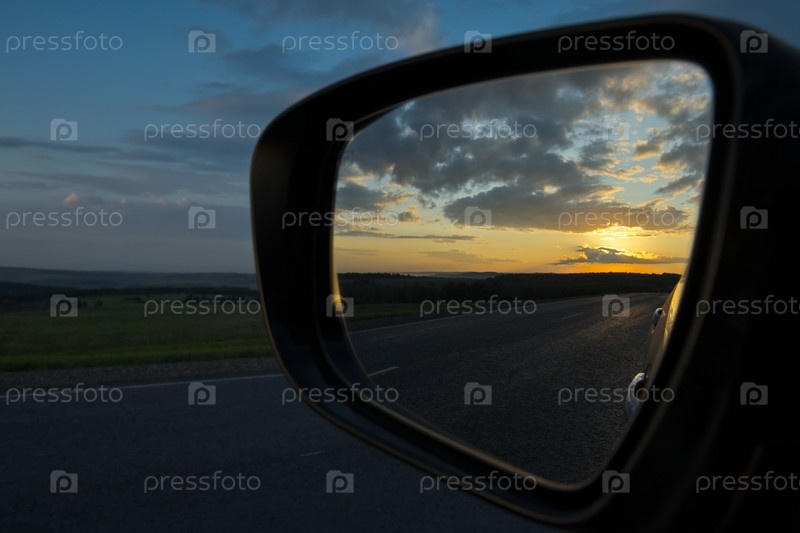 Россия. Юг Западной Сибири, Кемеровская область. Вид на закатное облачное небо через боковое зеркало автомобиля