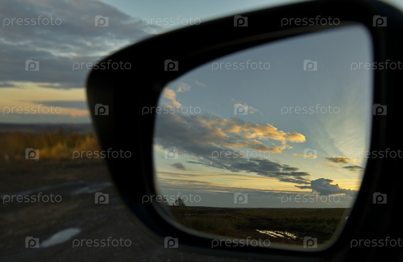 Россия. Юг Западной Сибири, Кемеровская область. Вид на закатное облачное небо через боковое зеркало автомобиля
