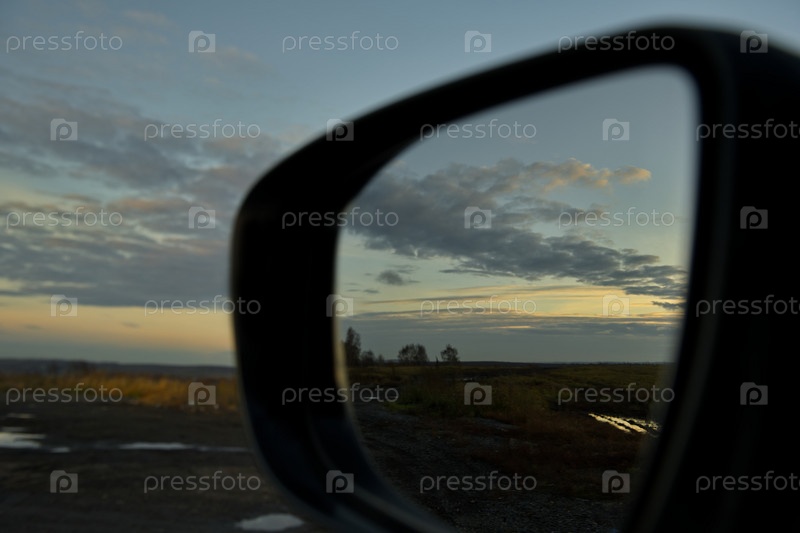 Россия. Юг Западной Сибири, Кемеровская область. Вид на закатное облачное небо через боковое зеркало автомобиля