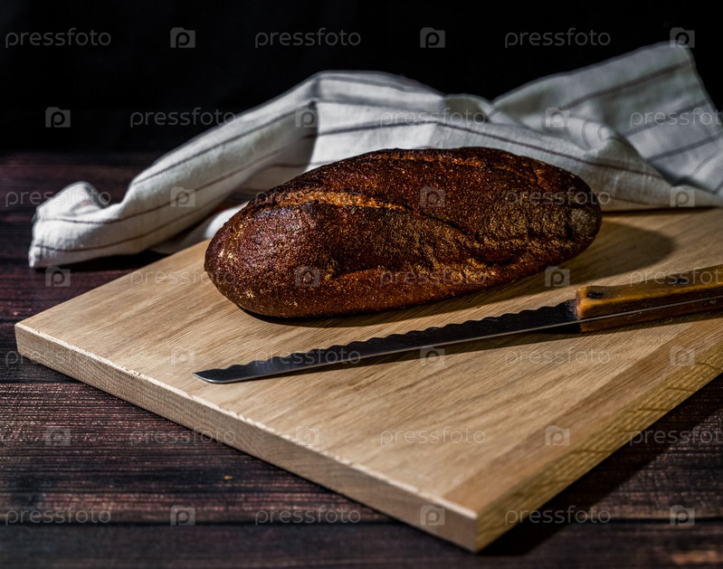 Батон ржаного хлеба с ножом и полотенцем лежат на разделочной доске