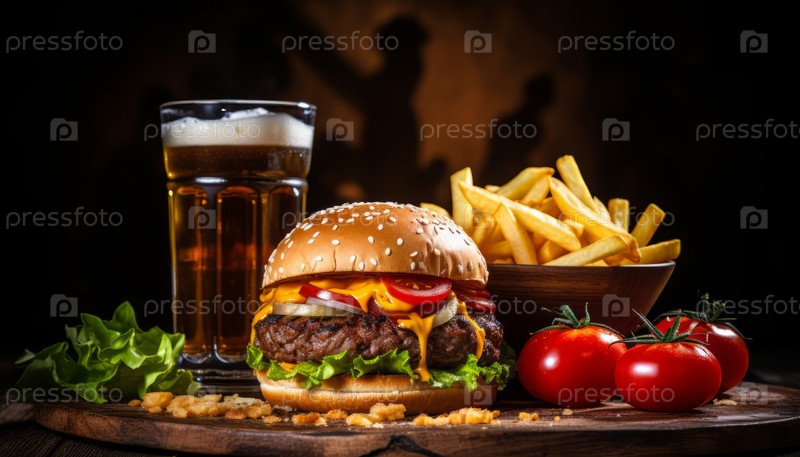 Вкусный и сочный гамбургер, картофель фри, кетчуп и стакан пива