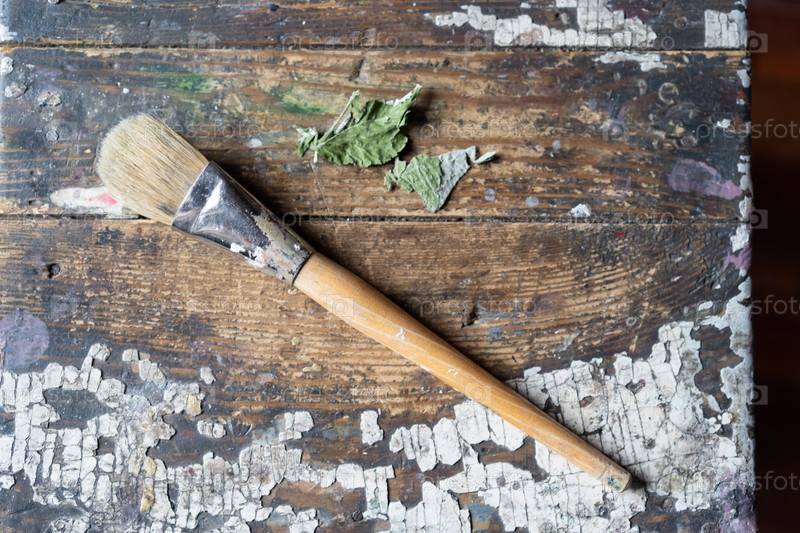 Сухие зеленые листья лежат на старой доске возле окна, покрашенной белой краской