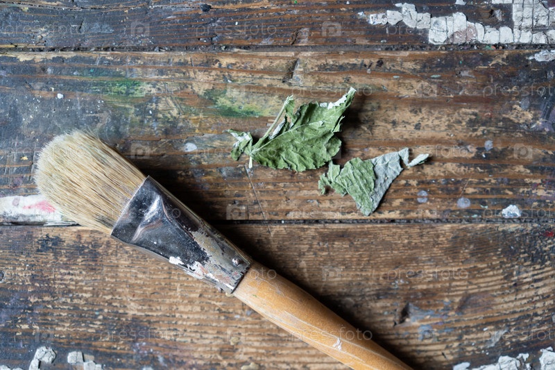 Сухие зеленые листья лежат на старой доске возле окна, покрашенной белой краской