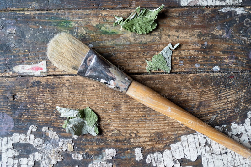 Сухие зеленые листья лежат на старой доске возле окна, покрашенной белой краской