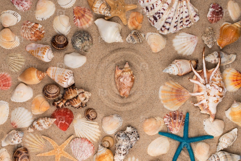 Ракушка в центре круга из песка, среди ракушек и звезд