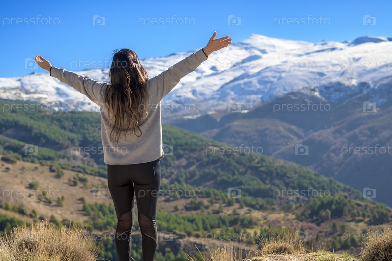 Латиноамериканка лежит на спине с вытянутыми руками и счастливо наслаждается зимним пейзажем на открытом воздухе