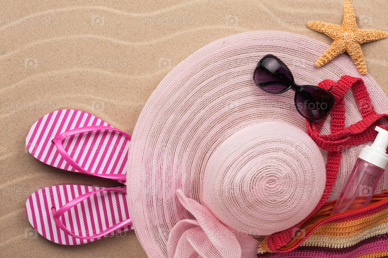 Аксессуары для пляжа, лежащие на песке, с местом для вашего текста