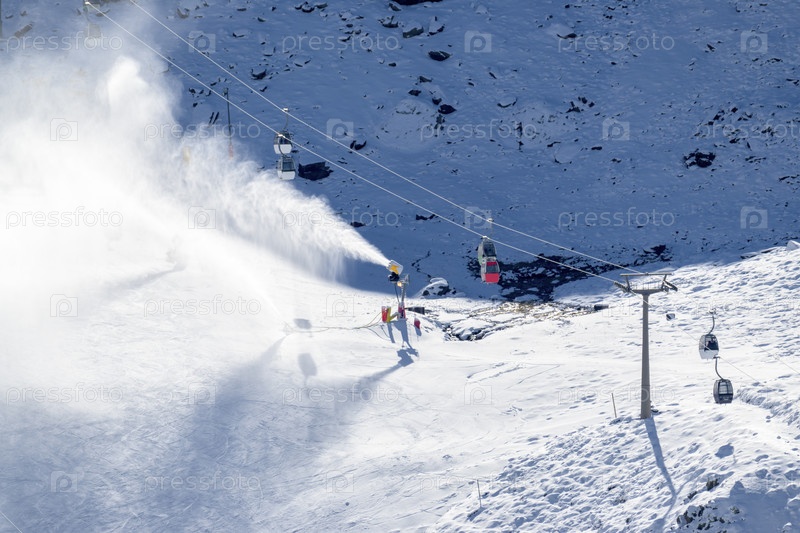 Снежные пушки, разбрасывающие снег на склонах рядом с канатной дорогой на горнолыжном курорте Сьерра-Невада