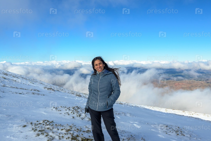 Портрет латиноамериканской женщины в снегу над облаками