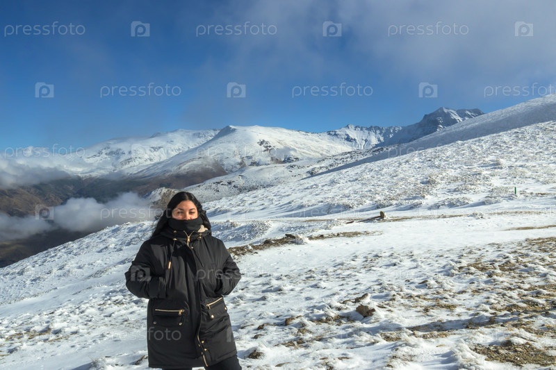 Молодая латиноамериканка позирует в черной куртке на заснеженной горе очень счастливая, свободная, полная, позитивная, наслаждающаяся жизнью