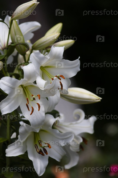 Белые лилии цветут на черном фоне, выборочный фокус