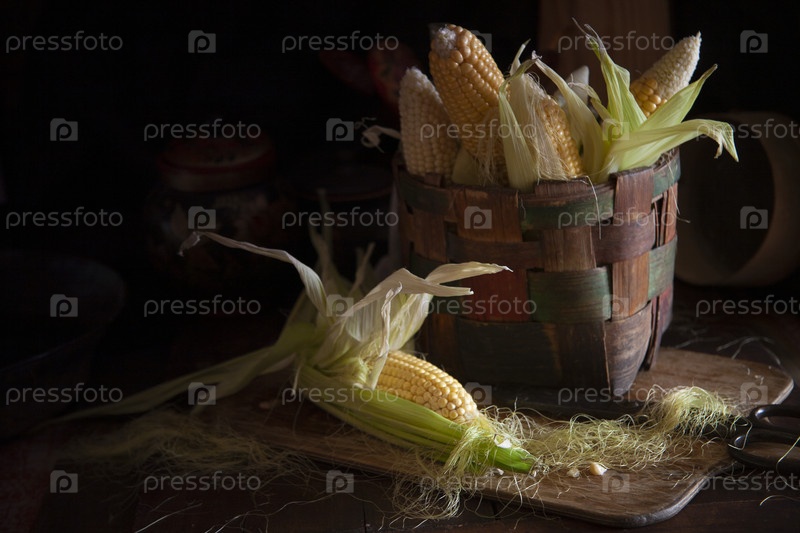 Свежие кукурузные початки в корзине на деревянном столе на винтажной угрюмой кухне