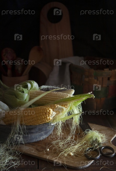 Кукурузные початки в винтажной медной тарелке на фермерской кухне