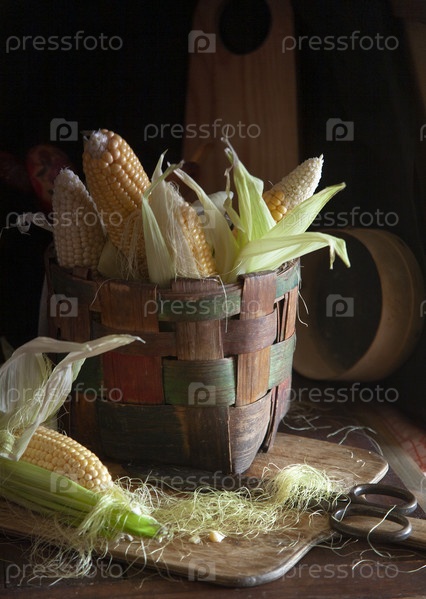 Свежие кукурузные початки в корзине на деревянном столе в деревенской угрюмой кухне