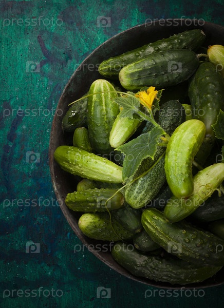 Свежие огурцы в винтажной металлической миске на темно-зеленом фоне
