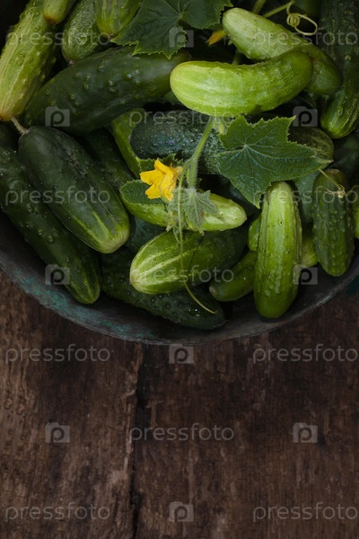 Свежие огурцы в винтажной металлической миске на деревянном столе