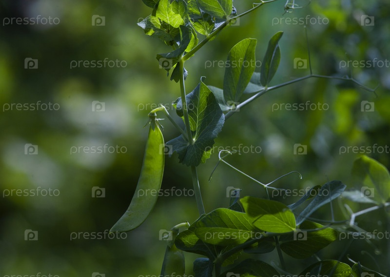Зеленый горошек на лозе в лучах солнца в огороде