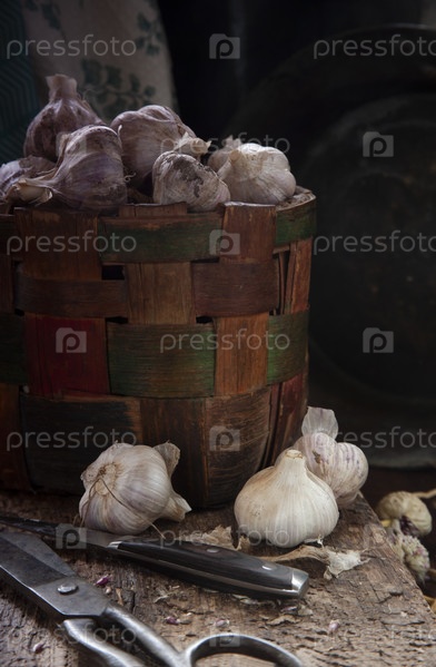 Чеснок в корзине на столе с ножом и ножницами, сдержанный, избирательный фокус