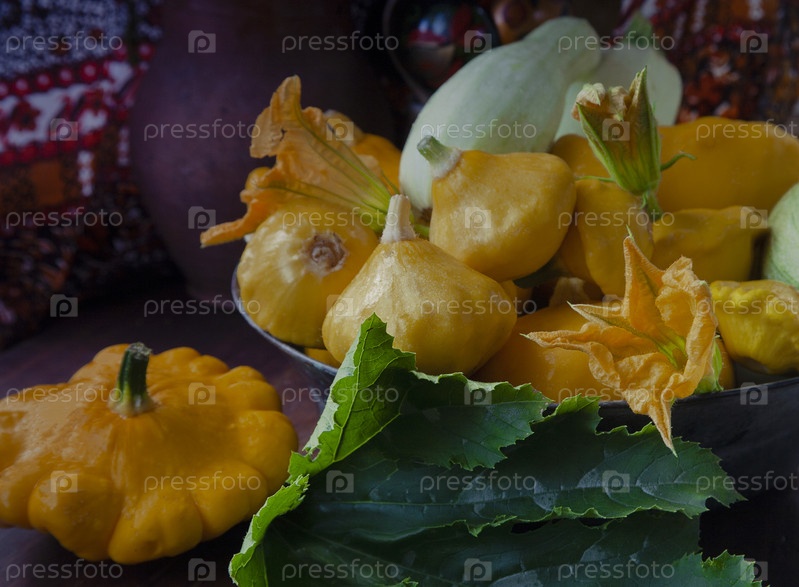 Желтые патиссоны с зелеными листьями и оранжевыми цветами в металлической чаше на красочном фоне, выборочный фокус
