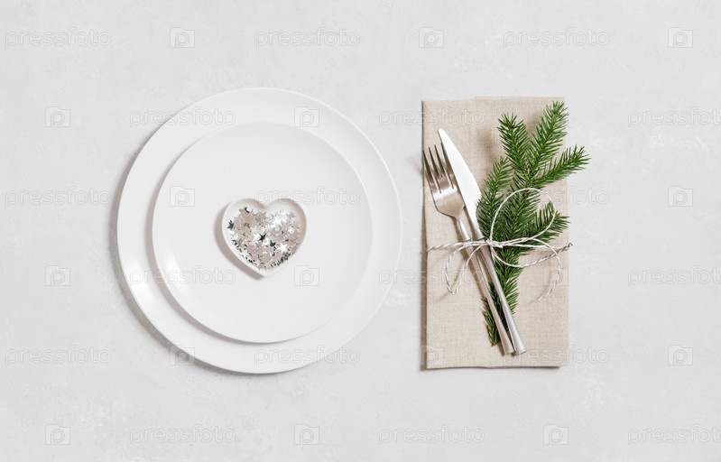 Сервировка новогоднего стола на белом фоне. Рождественский ужин с серебряным декором. Новогодняя вечеринка. Вид сверху